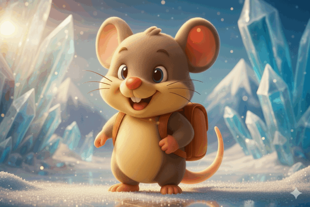 雪山の朝、光が差し込む中で、リールシャが左手を上げて挨拶している。